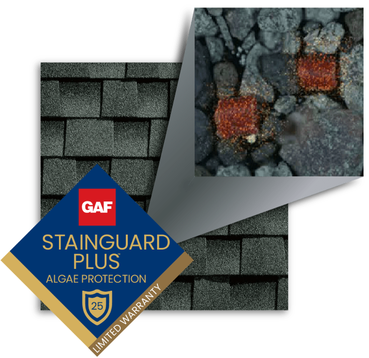 Time-Release Algae-Fighting Technology is proprietary to GAF. Specially engineered capsules are infused throughout with thousands of copper microsites. These breakthrough capsules release algae-fighting copper efficiently, over time, for long-lasting algae-fighting power.